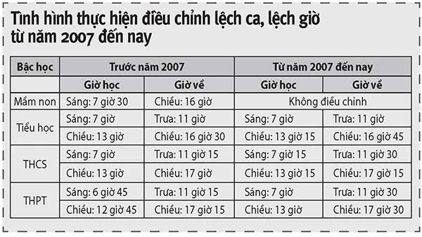 Theo báo cáo của Sở GD&ĐT TP.HCM, ngành giáo dục TP thực hiện đề án lệch ca, lệch giờ từ năm học 2006-2007. Sở cũng chỉ đạo các phòng GD&ĐT ký kết liên tịch với công an các quận, huyện để phối hợp giữ an ninh trật tự trước cổng trường. Với những trường có sân bãi rộng, Sở cũng yêu cầu cho phụ huynh vào trường đưa đón con, có phân luồng ra vào khác nhau. Hoặc nếu không phải thuê sân bãi để phụ huynh tiện đưa đón con. Nhờ đó giúp giảm tải ùn tắc trước cổng trường rất lớn.