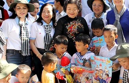 Nguyên Phó Chủ tịch nước Trương Mỹ Hoa, Trưởng ban chỉ đạo Chương trình “Vì học sinh Trường Sa thân yêu” cùng các đại biểu và các cháu học sinh trong ngày khánh thành ngôi trường trên đảo Sinh Tồn. Ảnh: Thanh Mận