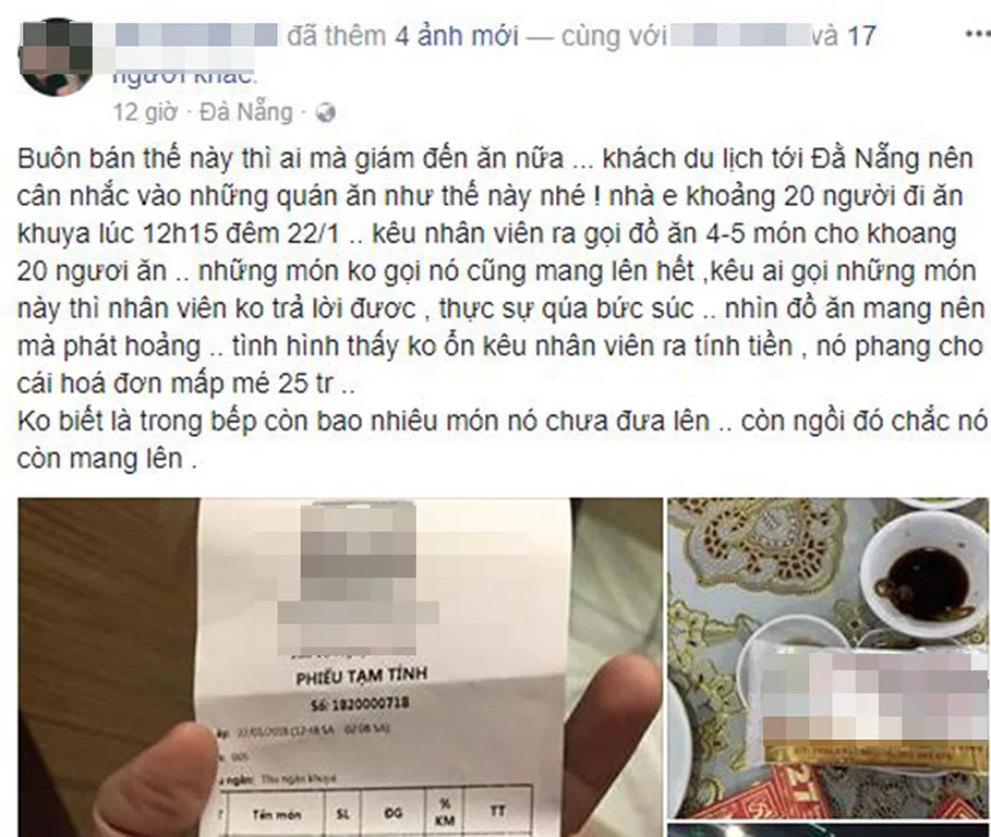 Theo nội dung, lúc 0 giờ 15 ngày 22-1, đoàn của anh khoảng 20 người đi ăn khuya tại một quán ăn ở Sơn Trà và có gọi nhân viên ra kêu 4-5 món. Anh cho hay những món không gọi họ cũng mang lên hết, kêu ai gọi những món này thì nhân viên không trả lời được. Khi tính tiền thì nhà hàng đưa giấy tính tiền gần 25 triệu đồng... “Buôn bán thế này thì ai mà dám đến ăn nữa... Khách du lịch tới Đà Nẵng nên cân nhắc vào những quán ăn như thế này nhé” - anh Phi Thiên Vũ bức xúc.