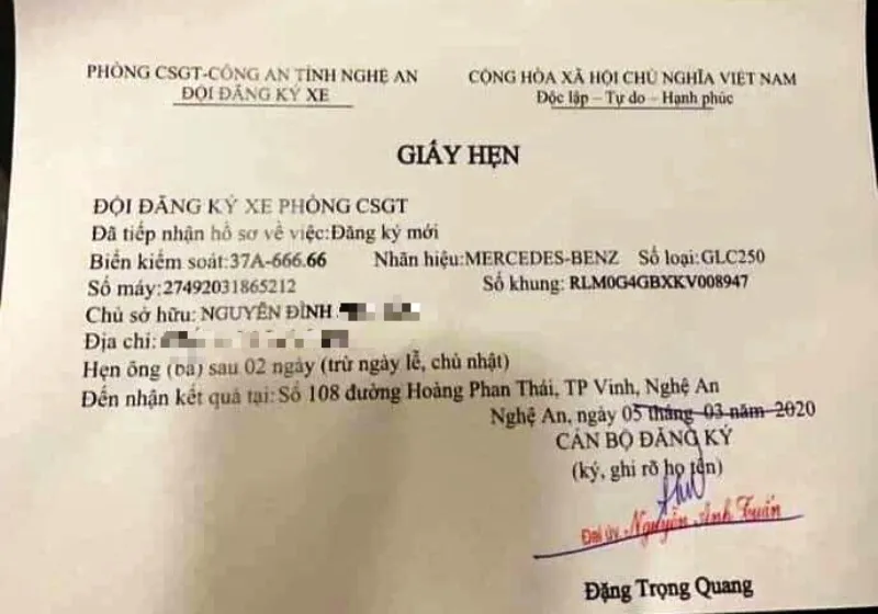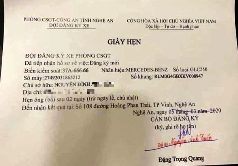 Ngày 5-3, mạng xã hội xuất hiện hình ảnh về giấy hẹn của Phòng CSGT Công an tỉnh Nghệ An hẹn đăng ký mới BKS 37A-666.66 cho xe con hiệu Mecrdes- Benz GLC250 của anh Nguyễn Đình A. (38 tuổi, trú TP Vinh, Nghệ An).