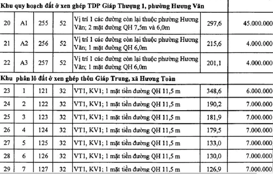 Trong bản phụ lục phê duyệt giá đất có lô A1, thửa đất 255, diện tích là hơn 297 m2 tại khu quy hoạch đất ở xen ghép tổ dân phố Giáp Thượng 1, phường Hương Văn có mức giá khởi điểm là 45 triệu đồng/m2. Trong khi các lô đất A2, A3 cạnh bên chỉ được định giá 4 triệu đồng/m2.