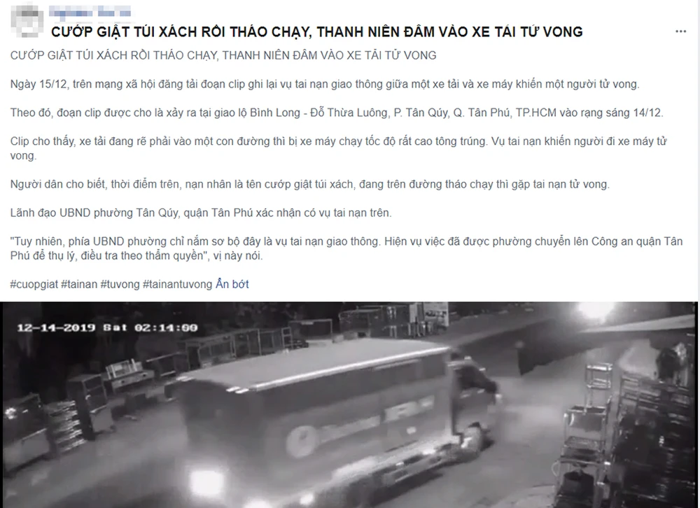 Thông tin ban đầu, khoảng 2 giờ 14 phút ngày 14-12, hai thanh niên đi xe máy biển số Thừa Thiên-Huế chạy trên đường Bình Long, hướng từ ngã tư Bốn Xã về đường Tân Kỳ Tân Quý.