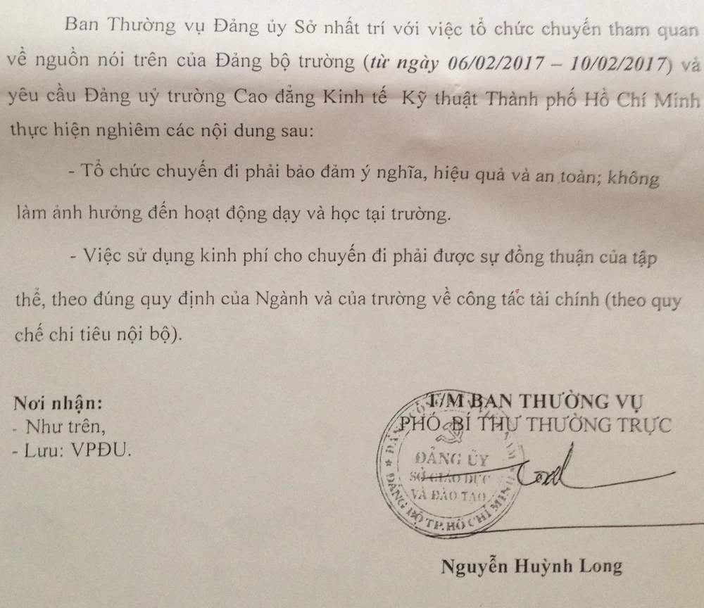 Công văn phê duyệt chuyến tham quan du lịch về nguồn của Đảng ủy Sở GD-ĐT TP.HCM. Ảnh: AN NHIÊN