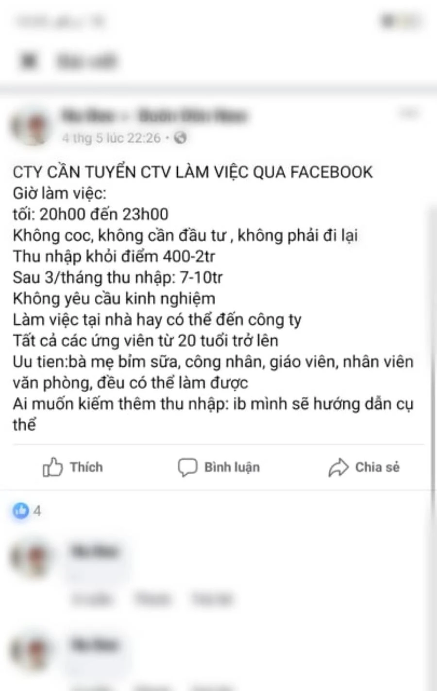 Đơn cử như các mẫu tuyển dụng: "Tuyển nhân viên kinh doanh lương 10 triệu/tháng không cần kinh nghiệm và bằng đại học, thời gian làm việc linh động". Hay "Tuyển cộng tác viên online, làm ca 4 tiếng/ngày thu nhập 6 triệu/tháng chưa kể hoa hồng"…