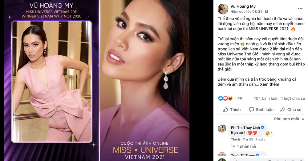 Cụ thể, trên trang cá nhân của mình, Hoàng My chia sẻ rằng: “Thể theo vô số nghìn lời thách thức và vài chục lời động viên ủng hộ, năm nay mình quyết come back tại cuộc thi Miss Universe 2021!”