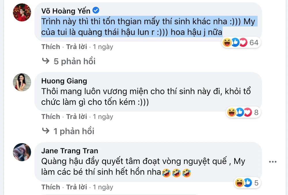 Võ Hoàng Yến mang cả “vựa muối” vào bình luận: “Trình này thì thi tốn thời gian mấy thí sinh khác nha. My của tui là hoàng thái hậu luôn rồi, hoa hậu gì nữa”, khiến fan cười nghiêng ngả. Nhiều người nghi ngờ tính chân thực của thông tin này.