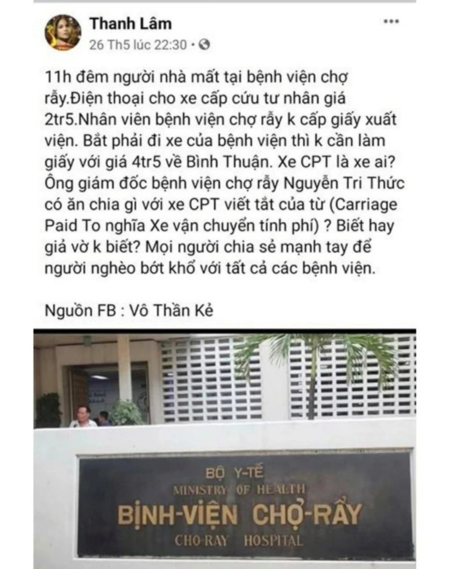 Sáng 14-6, mạng xã hội lan truyền thông tin có nội dung: “11 giờ đêm người nhà mất tại Bệnh viện (BV) Chợ Rẫy. Điện thoại cho xe cấp cứu tư nhân giá 2,5 triệu đồng. Tuy nhiên nhân viên BV không cấp giấy xuất viện mà bắt phải đi xe của BV với giá 4,5 triệu đồng về Bình Thuận”.