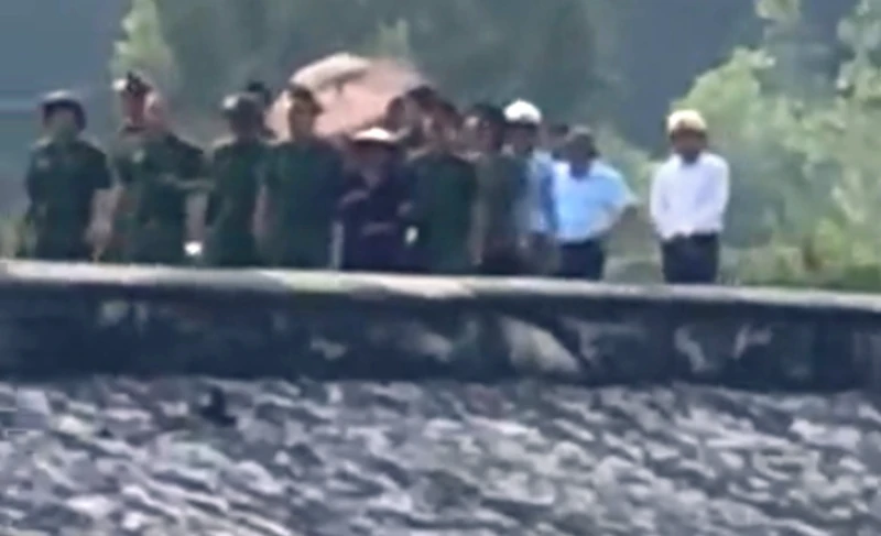 Hàng trăm người dân cũng ra bao quanh bờ đập Bàu Ganh (xã Hậu Thành) để xem thực nghiệm hiện trường.