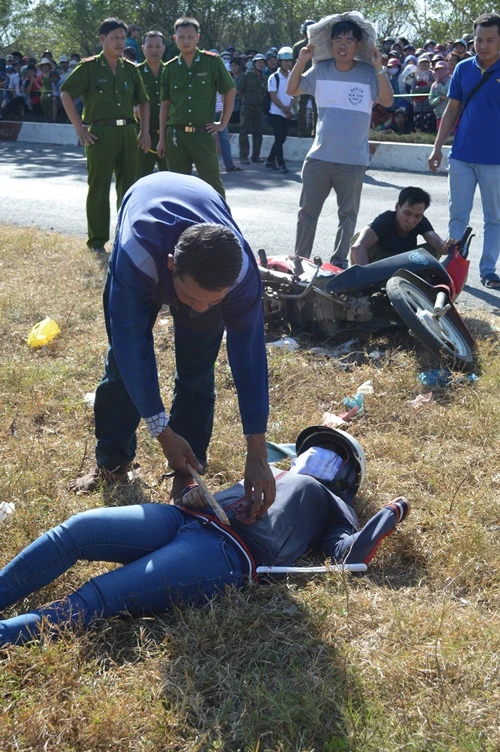 Theo đó, vào khoảng 2 giờ sáng 7-12, Em chở Hên chạy xe máy trên đường Hoàng Sa - hướng từ xã Long Sơn qua đến địa bàn xã Tân Hải. Lúc này phát hiện bà Trong đang chạy xe máy phía trước, Em chạy ép xe vào xe khiến bà ngã xuống đường, văng ra cách vị trí xe đổ khoảng 1 m.