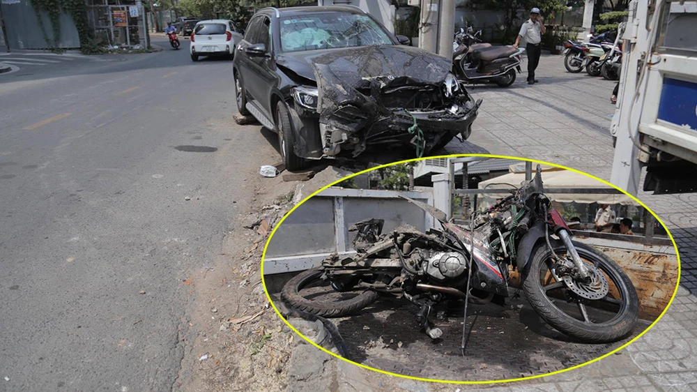 Công an đưa tài xế 32 tuổi Nguyễn Trần Hoàng Phong cùng chiếc Mercedes 51G 902.57 và xe máy của nạn nhân đến hiện trường để thực nghiệm.