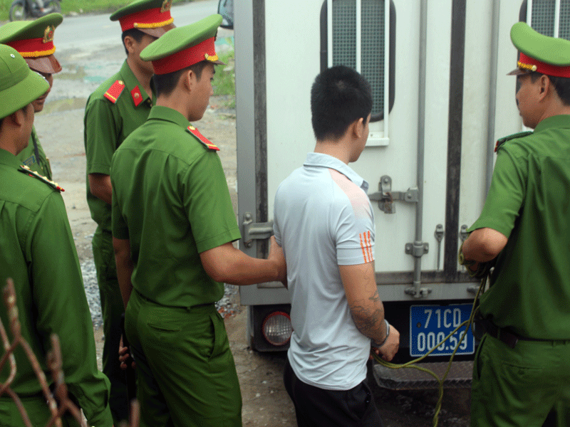 Đưa nghi phạm ra xe đặc chủng chở về trại giam sau khi hoàn thành công tác thực nghiệm.
