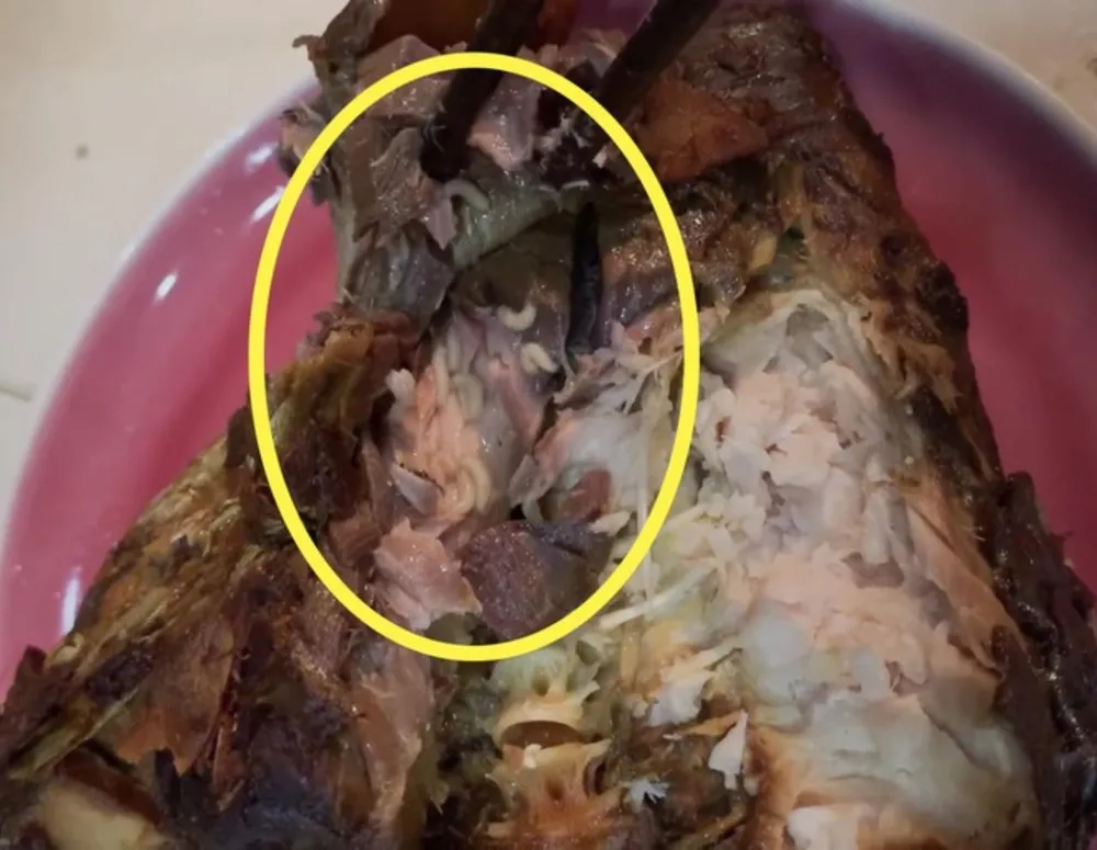 Hình ảnh giòi bò lúc nhúc trong khúc cá kho mua tại một cửa hàng thuộc chuỗi thực phẩm sạch CleverFood. Ảnh chụp màn hình