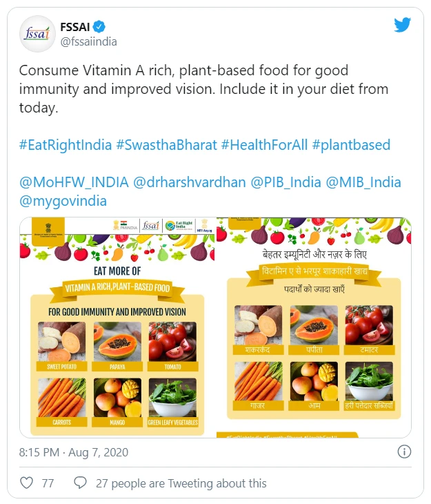 FSSAI đăng tải trên Twitter: “Hãy tiêu thụ thực phẩm giàu Vitamin A có nguồn gốc thực vật để có khả năng miễn dịch tốt và cải thiện thị lực.”