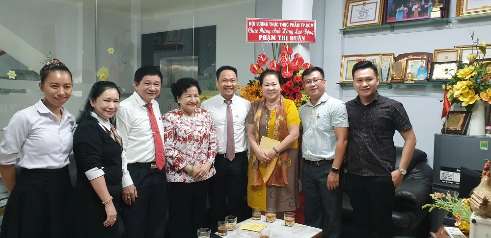 Đại điện Hội lương thực thực phẩm TP.HCM đế thăm và chúc mừng bà Phạm Thị Huân, chủ tịch HĐQT, giám đốc công ty CP Ba Huân. Ảnh: CHÂU NGUYÊN