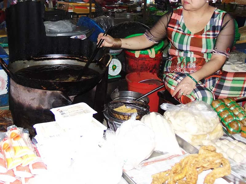 Một tiểu thương chiên đậu hủ trong chảo dầu đen. Ảnh: TRẦN NGỌC
