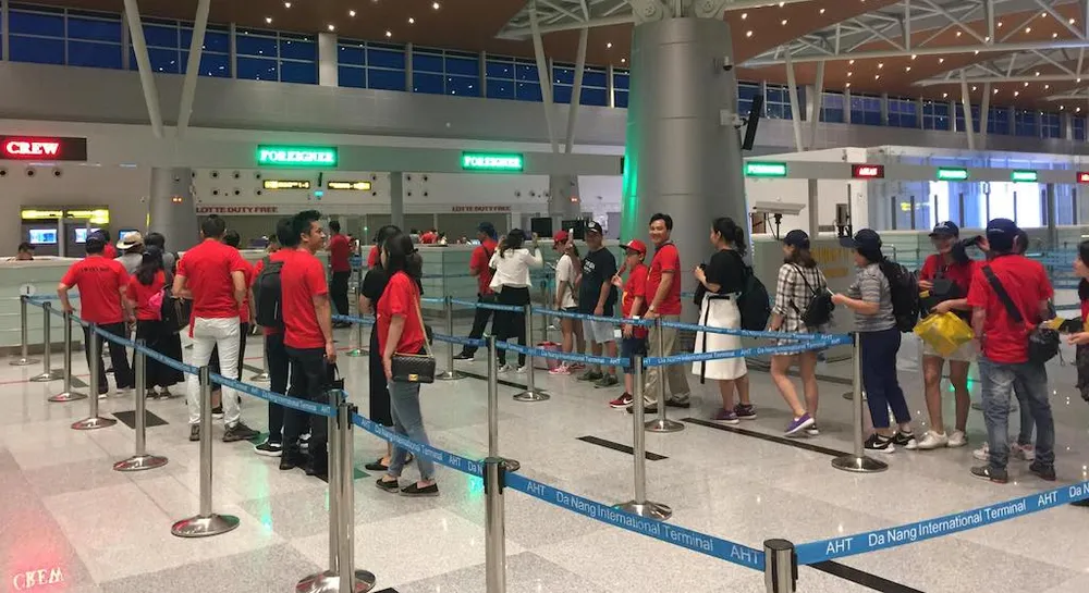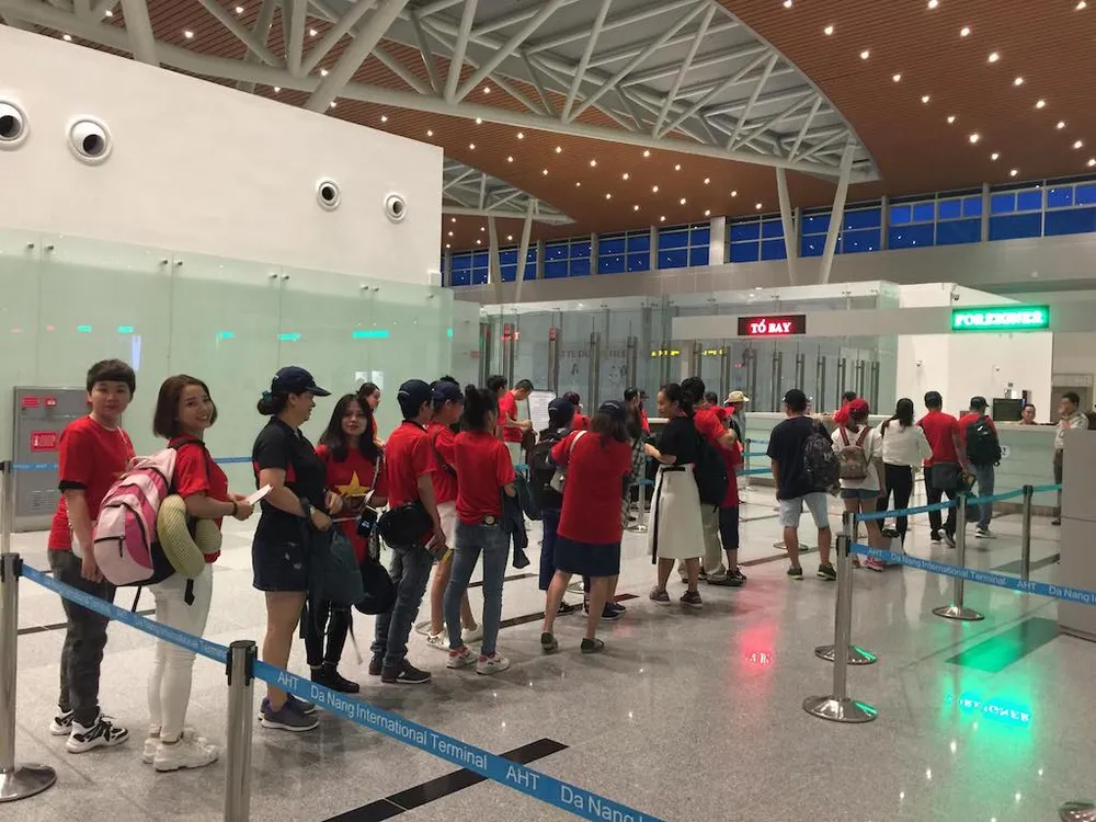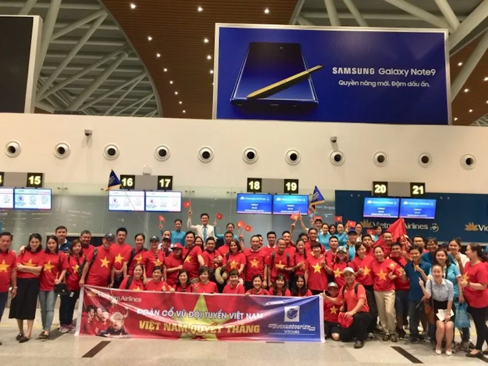Các cổ động viên làm thủ tục bay sang Indonesia để cổ vũ cho đội tuyển Việt Nam. Ảnh: T.TÙNG