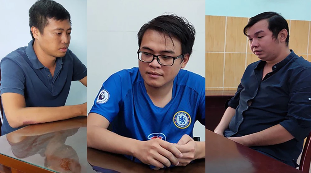 Trung, Thắng và Hạo (từ trái qua) tại cơ quan điều tra. Ảnh CA