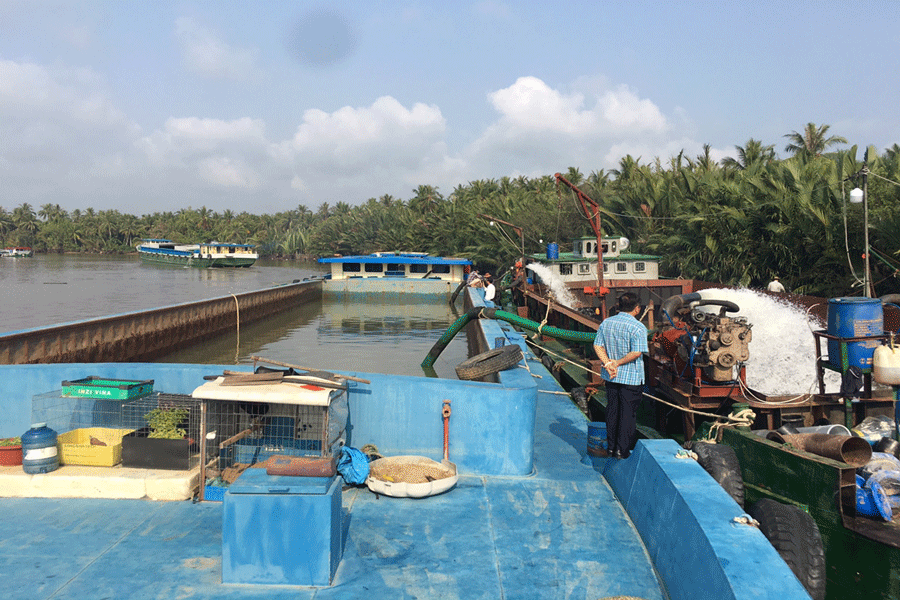 Công ty Cổ phần cấp thoát nước Bến Tre thuê sà lan chở nước ngọt về nhà máy nước xử lý, cấp cho dân. Ảnh: ĐÔNG HÀ