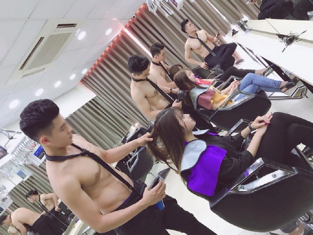 Đoạn clip được cho là do cửa hàng này đăng tải cho thấy các khách hàng nữ tới tiệm để làm tóc được dàn nhân viên “trai đẹp” cởi trần mở cửa đón tiếp rất nhiệt tình.