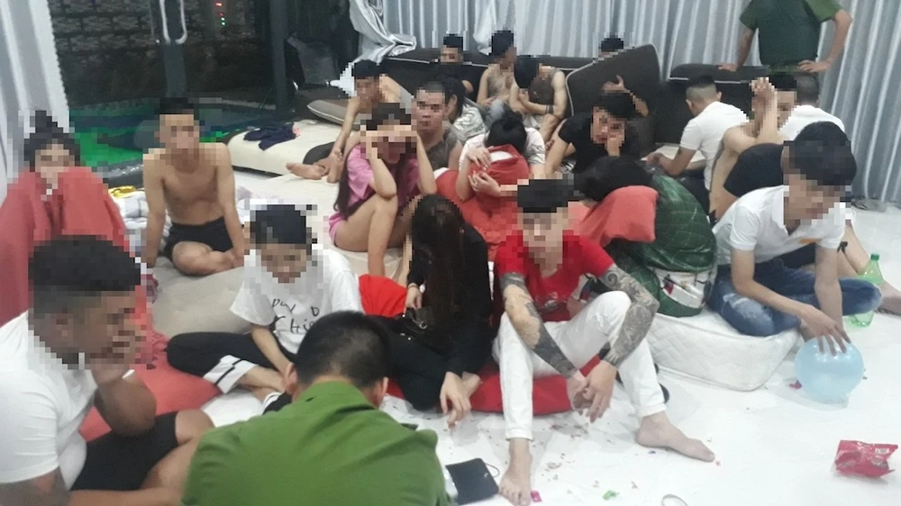 Sau khi vào được căn hộ, qua kiểm tra, công an phát hiện 24 người có biểu hiện phê ma túy cùng nhiều dụng cụ sử dụng ma túy (dĩa, nỏ, ống hút). Kết quả test, 22 người dương tính với ma túy tổng hợp.