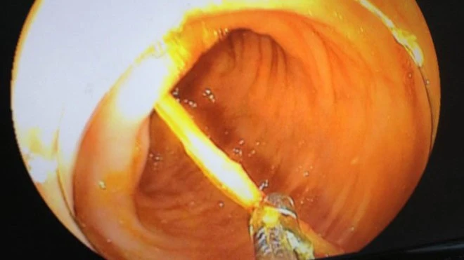Hình ảnh nội soi thấy chiếc tăm tre đâm vào thành đại tràng của bệnh nhân. Ảnh: TTO