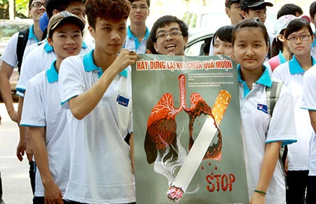 Sinh viên thủ đô tuyên truyền phòng, chống tác hại của thuốc lá. Ảnh: TTXVN