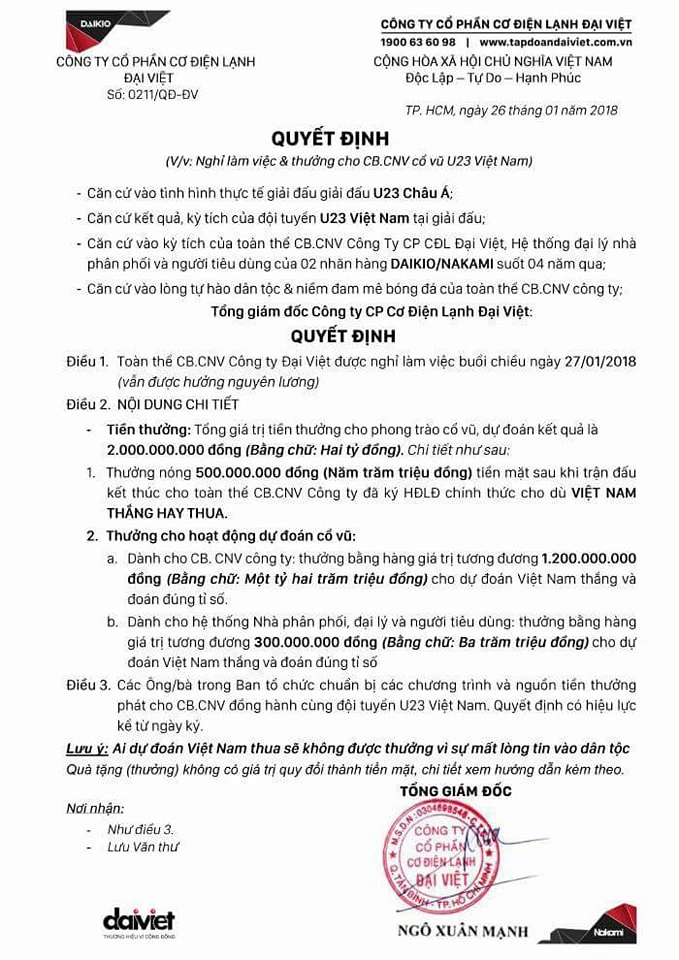 Ngày 26-1, Công ty Cổ phần Cơ điện lạnh Đại Việt (TP.HCM) đã có quyết định cho toàn thể cán bộ nhân viên được nghỉ chiều 27-1 vẫn được hưởng nguyên lương để xem, cổ vũ cho đội bóng đá U-23 VN đá trận chung kết với U-23 Uzbekistan.