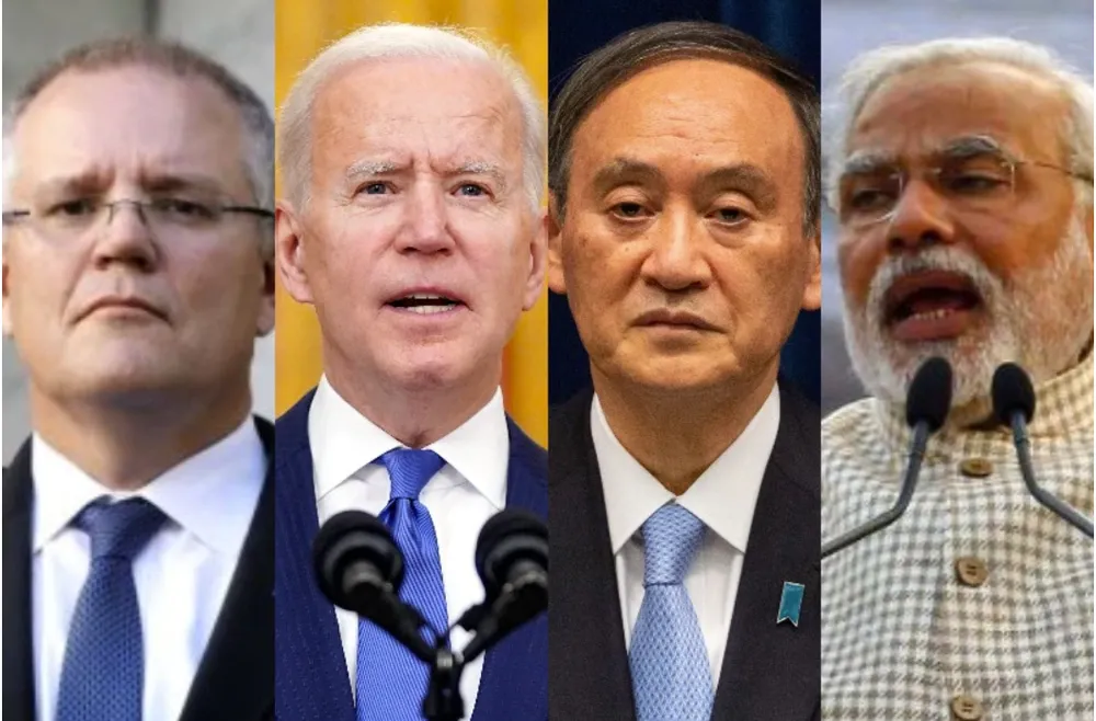 Tổng thống Mỹ Joe Biden, Thủ tướng Nhật Yoshihide Suga, Thủ tướng Ấn Độ Narendra Modi và Thủ tướng Úc Scott Morrison đã có cuộc họp trực tuyến qua màn hình lớn. Các lãnh đạo thảo luận về việc Trung Quốc áp lệnh trừng phạt đối với các sản phẩm của Úc, tăng cường hoạt động xung quanh quần đảo Senkaku của Nhật và gây hấn tại biên giới Ấn Độ ”, Cố vấn An ninh Quốc gia Mỹ Jake Sullivan cho biết trong một cuộc họp báo tại Washington sau cuộc hội đàm.