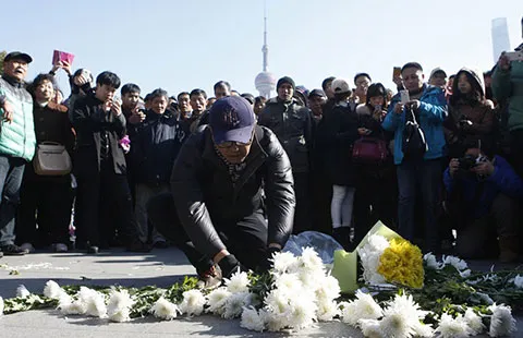 Người dân đặt hoa trắng tưởng niệm những nạn nhân xấu số trong vụ giẫm đạp tại Thượng Hải đêm giao thừa 2015. Ảnh: UPA