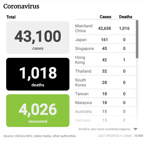 Cho đến chiều 11-2, bệnh do virus Corona đã lây nhiễm cho hơn 43.000 người và giết chết hơn 1.000 người ở Trung Quốc kể từ khi dịch bắt đầu bùng phát ở thành phố Vũ Hán, thuộc tỉnh Hồ Bắc của Trung Quốc vào tháng 12-2019.