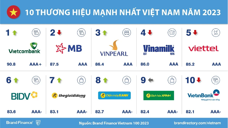 Vietcombank là thương hiệu mạnh nhất trong bảng xếp hạng năm nay, tăng ba bậc lên vị trí thứ 4 trong bảng xếp hạng.