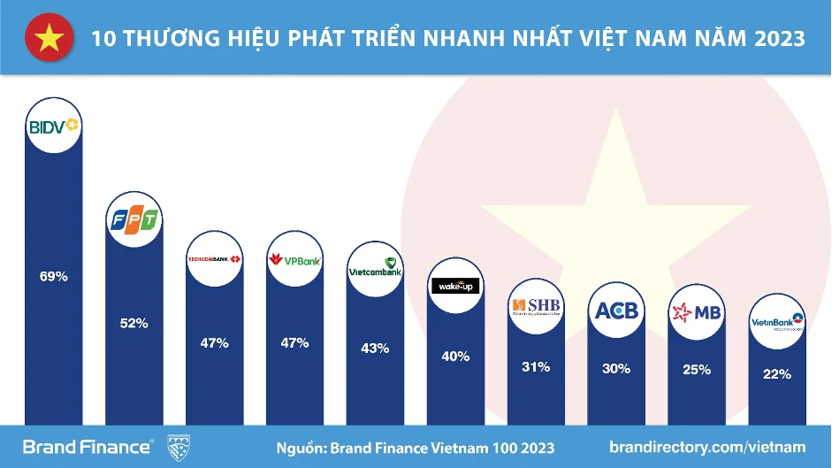 Bên cạnh đó, Ngân hàng Đầu tư và Phát triển Việt Nam (BIDV) là thương hiệu tăng trưởng nhanh nhất, tăng sáu bậc lên vị trí thứ 7.