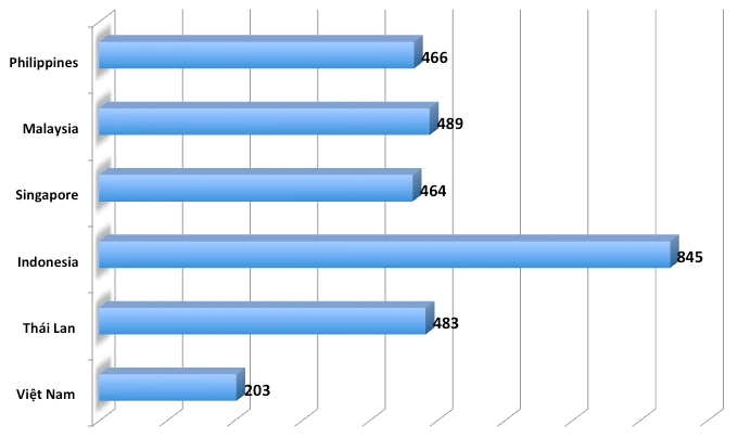 Giá trị thương hiệu quốc gia Việt Nam so với một số nước trong khu vực. Đơn vị tỉ USD