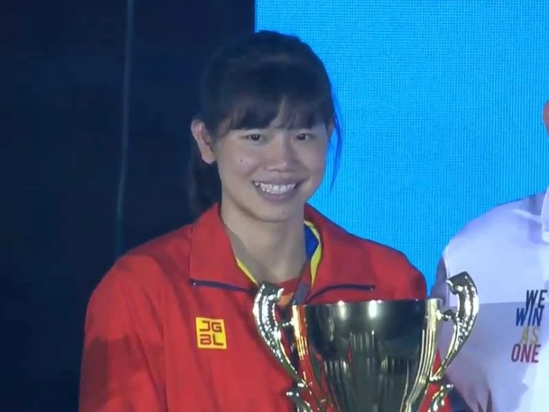 Nhận danh hiệu nữ VĐV xuất sắc nhất SEA Games nhưng vẫn sợ bị la vì thành tích đi xuống. Ảnh: NGỌC DUNG