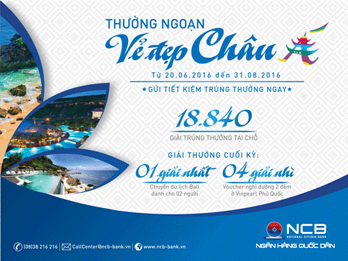 Chương trình triển khai từ nay đến ngày 31-8 với tổng giải thưởng gần 600 triệu đồng. Theo đó, khách hàng cá nhân gửi tiết kiệm từ 100 triệu đồng kỳ hạn một tháng trở lên sẽ được tặng một thẻ cào điện tử trúng thưởng tiền mặt tại chỗ với giá trị thẻ cào 500.000 đồng. Ngoài ra, với mỗi 10 triệu đồng gửi tiết kiệm, khách hàng sẽ nhận được một phiếu dự thưởng để tham gia quay số cuối chương trình với nhiều giải thưởng hấp dẫn. Gửi càng nhiều, cơ hội quay số trúng thưởng càng lớn (19.000 giải thưởng). NCB sẽ tổ chức quay số cuối kỳ cho tất cả khách hàng đã tham gia chương trình. Năm khách hàng may mắn nhất sẽ nhận được các giải thưởng giá trị gồm: một giải nhất là chuyến du lịch Bali dành cho hai người; bốn giải nhì là voucher nghỉ dưỡng hai đêm ở Vinpearl Phú Quốc. Xem thông tin chi tiết trên trang web: www.ncb-bank.vn hoặc các điểm giao dịch của NCB.