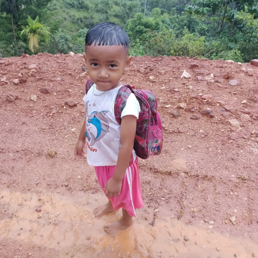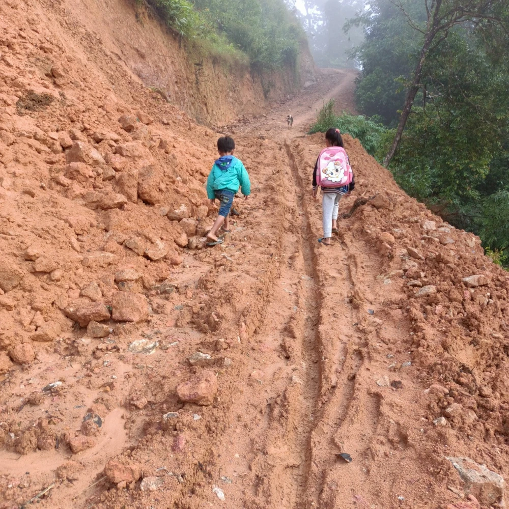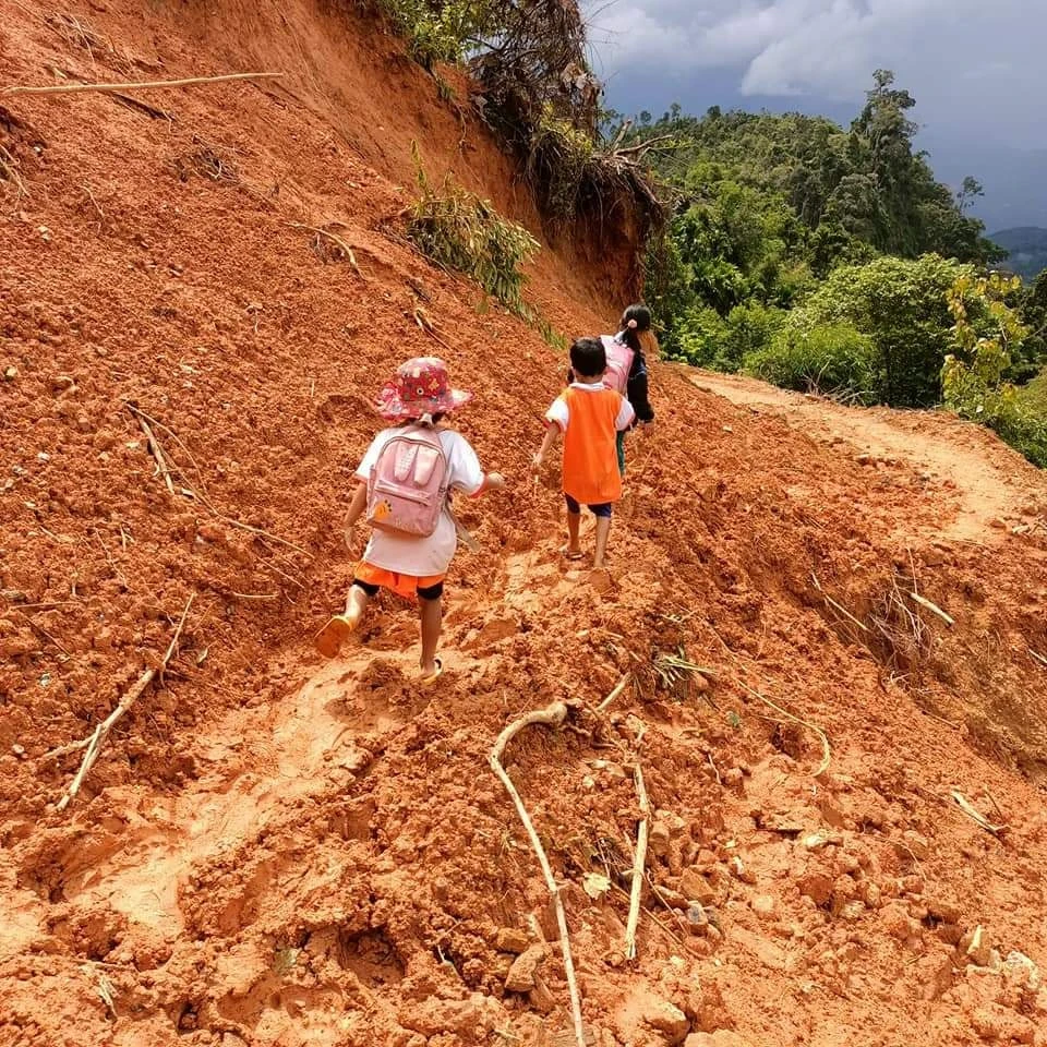 Đây là hình ảnh các cháu ở độ tuổi mẩu, giáo lớp 1, lớp 2 đến trường ở thôn 1, xã Trà Vân, Nam Trà My, Quảng Nam. Mỗi ngày, các cháu phải đi từ làng ông Thương lên điểm trường ông Dũ, khoảng 30 phút đi bộ. Mấy hôm nay mưa nên khu vực này bị sạt đất nhẹ, làm lầy thêm con đường đã khó đi.