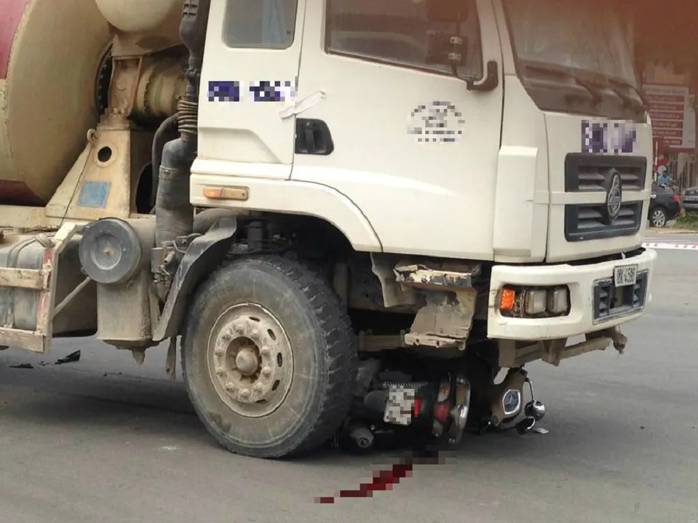 Sau va chạm, chiếc xe bồn cuốn xe máy vào gầm, khiến hai nạn nhân tử vong tại chỗ.