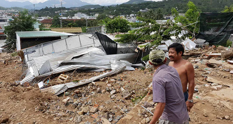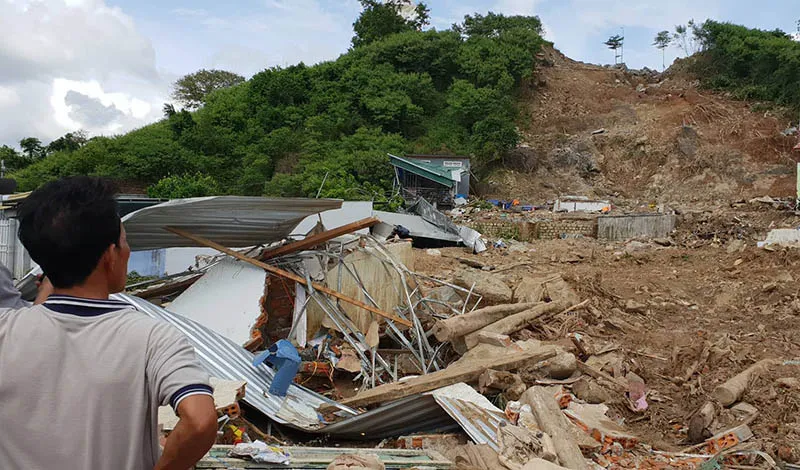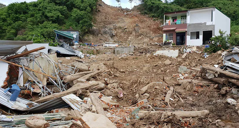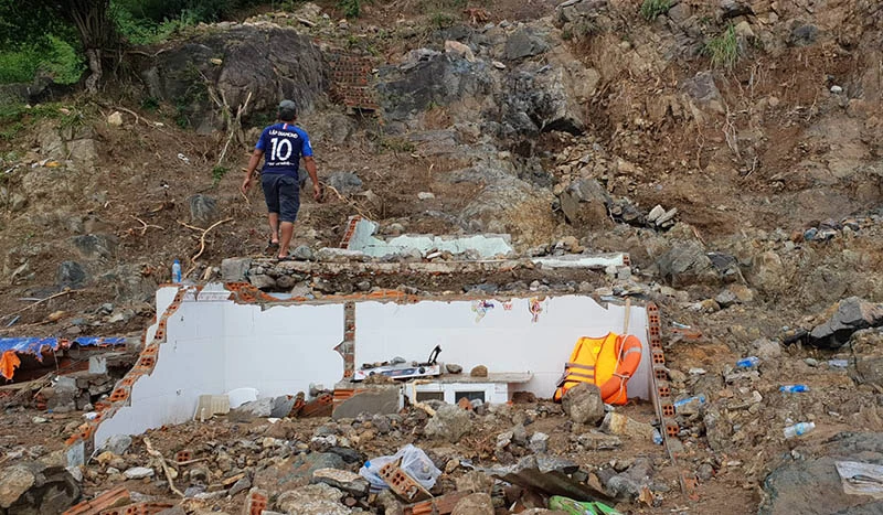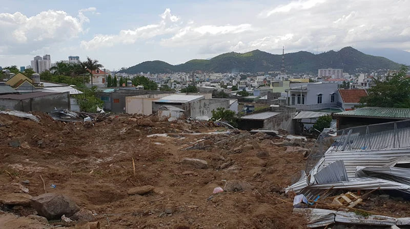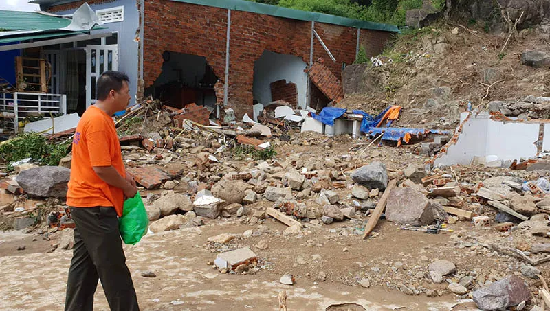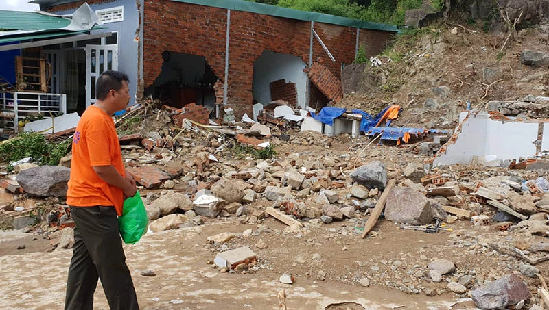 Hơn 10 căn nhà dưới chân núi ở tổ dân phố Hòa Tây, phường Vĩnh Hòa, TP Nha Trang (Khánh Hòa) đã bị nước phá hủy hoàn toàn. Nhiều căn giờ chỉ còn trơ trọi nền cùng đất đá ngổn ngang.