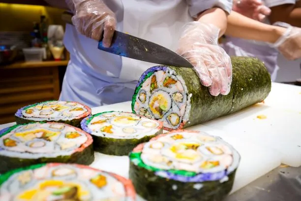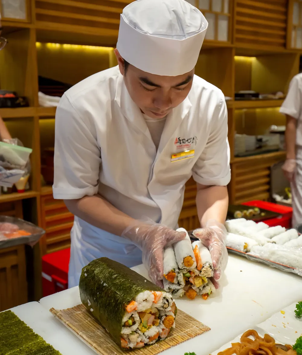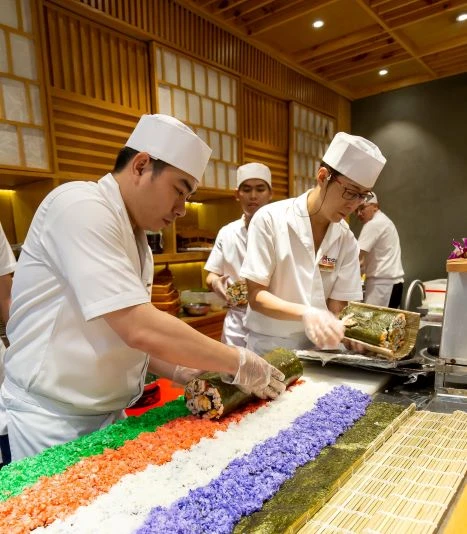 Các đầu bếp đang cuộn các cuộn sushi bình thường