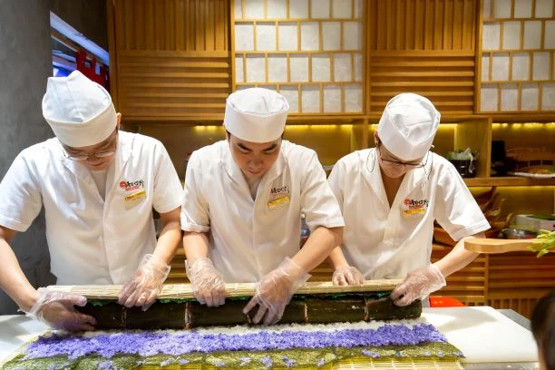 Các đầu bếp cùng phối hợp khéo léo "nối" các cuộn sushi lại với nhau