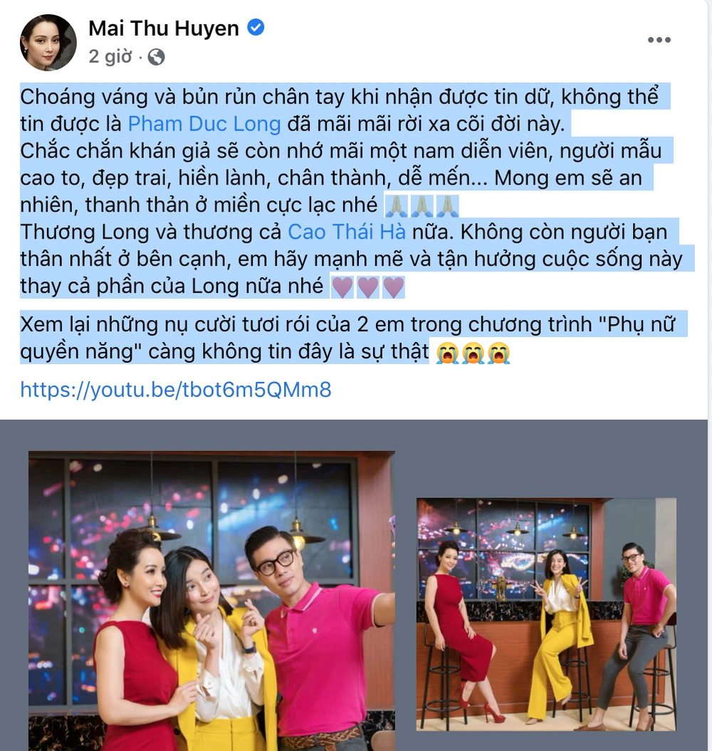 Thương Long và thương cả Cao Thái Hà nữa. Không còn người bạn thân nhất ở bên cạnh, em hãy mạnh mẽ và tận hưởng cuộc sống này thay cả phần của Long nữa nhé. Xem lại những nụ cười tươi rói của 2 em trong chương trình "Phụ nữ quyền năng" càng không tin đây là sự thật”- Mai Thu Huyền chia sẻ.
