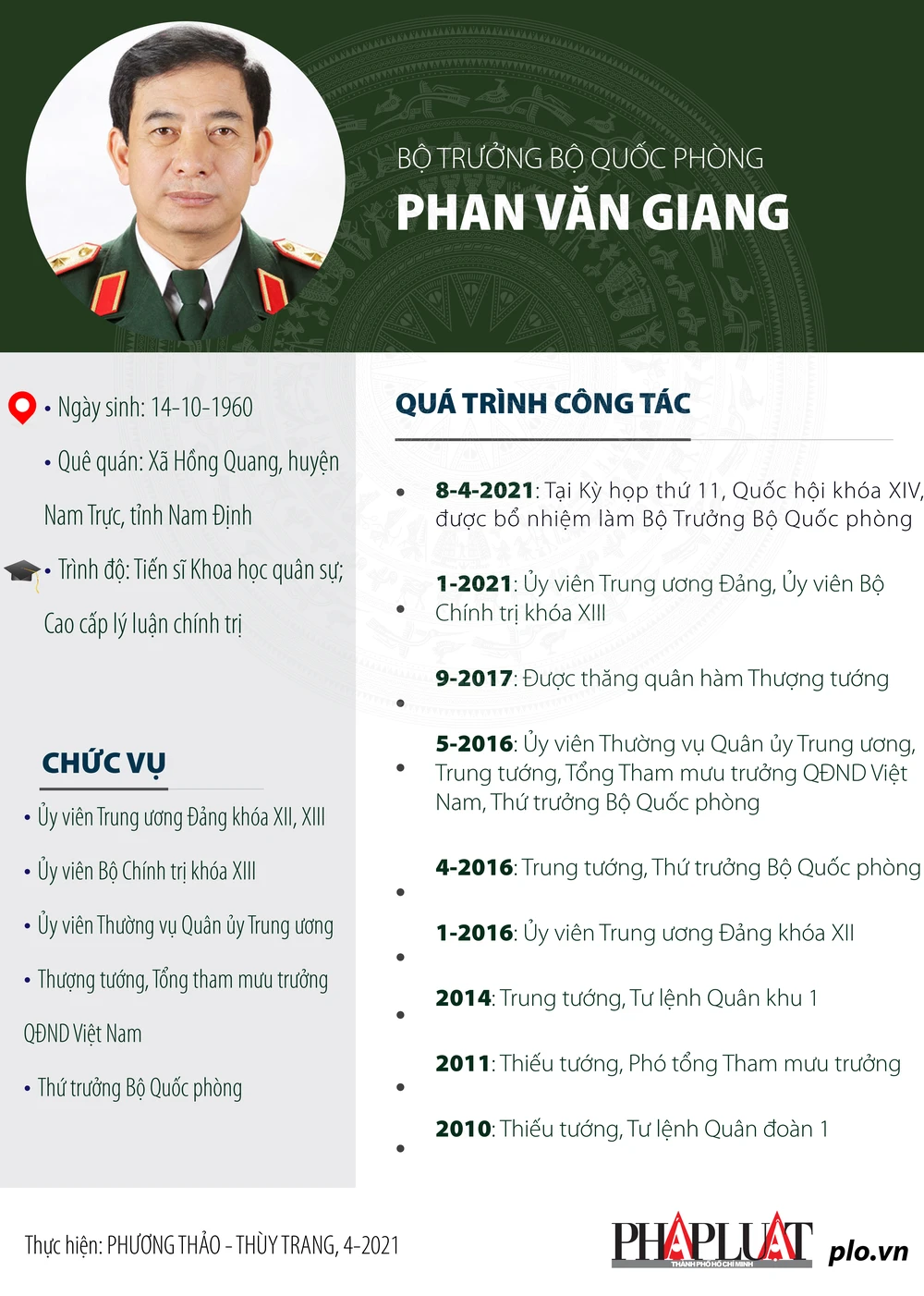 (PLO)- Sáng 8-4, Quốc hội đã phê chuẩn đề nghị bổ nhiệm Thượng tướng Phan Văn Giang, Tổng Tham mưu trưởng Quân đội Nhân dân Việt Nam, Thứ trưởng Bộ Quốc phòng làm Bộ trưởng Bộ Quốc phòng.