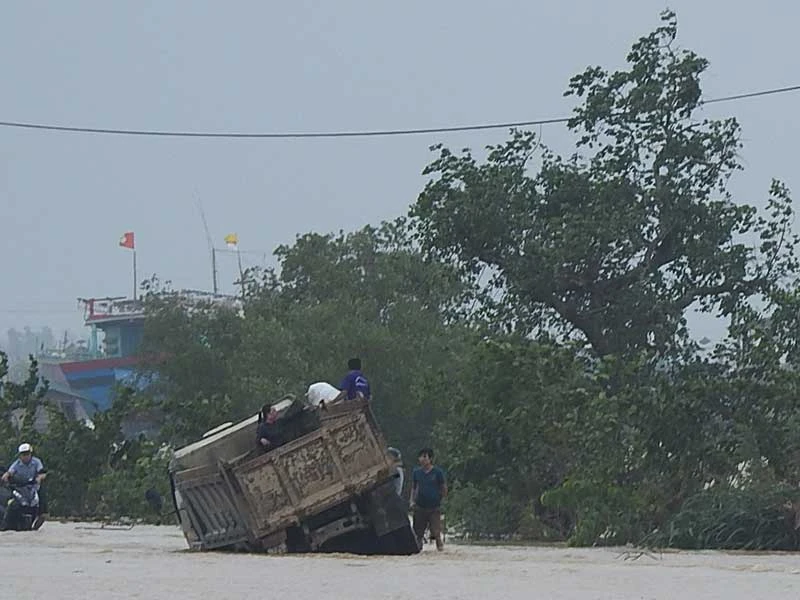 Xe tải ở Quảng Bình chạy trong lũ, chở theo sáu người đã bị trượt bánh, nghiêng hẳn qua một bên nhưng rất may xe không bị lật. Ảnh: MQ