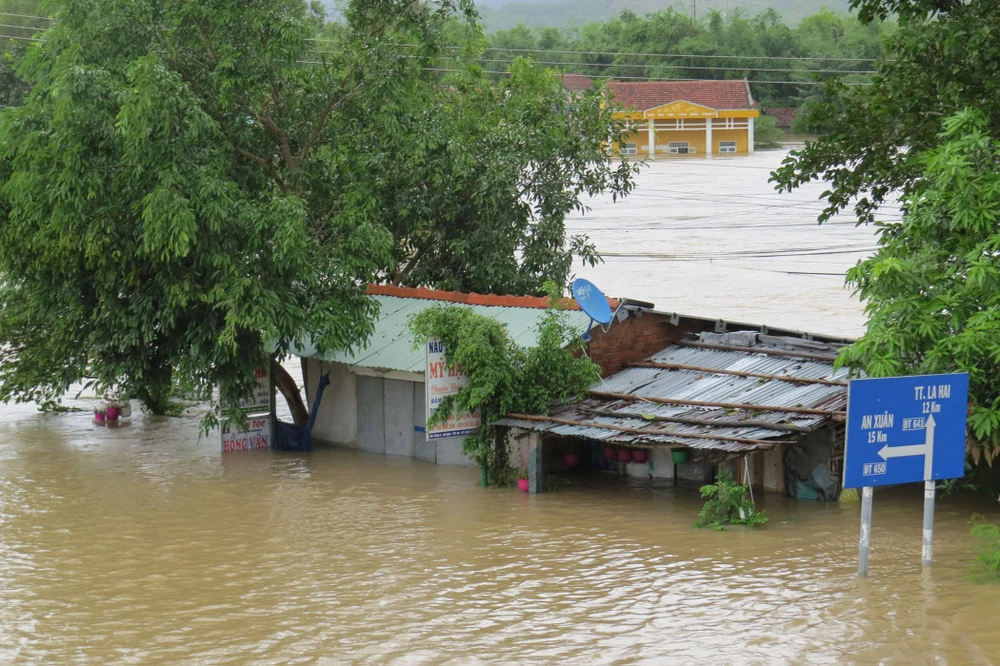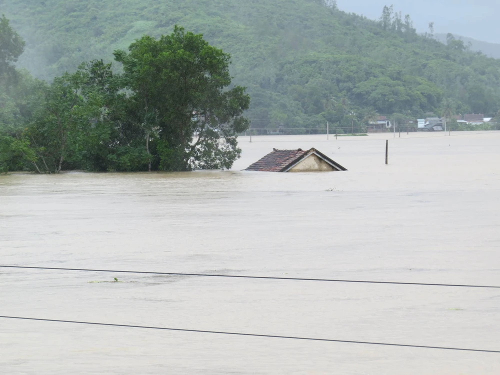 Nhiều vùng dân cư ở huyện Đồng Xuân, tỉnh Phú Yên bị ngập sâu trong nước. Ảnh: MHN