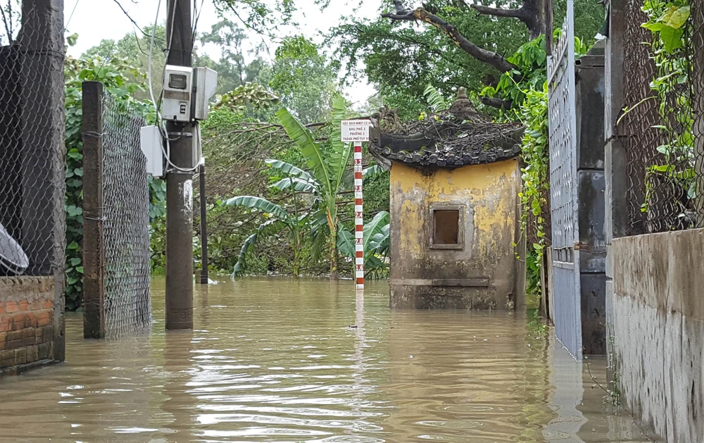Một số vùng ngoại ô TP Tuy Hòa bắt đầu bị ngập do thủy điện xả lũ. Ảnh: TẤN LỘC