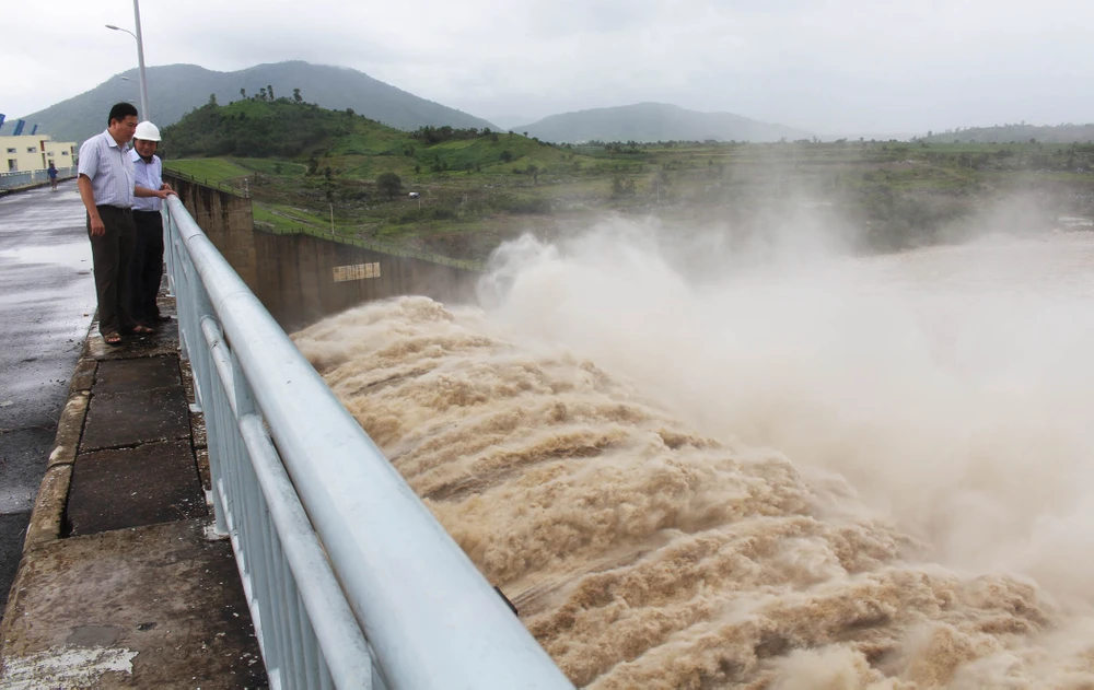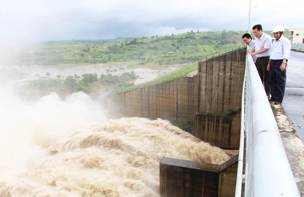 Phó chủ tịch UBND tỉnh Phú Yên kiểm tra Nhà máy thủy điện Sông Ba Hạ xả lũ ngày 3-11. Ảnh: TẤN LỘC