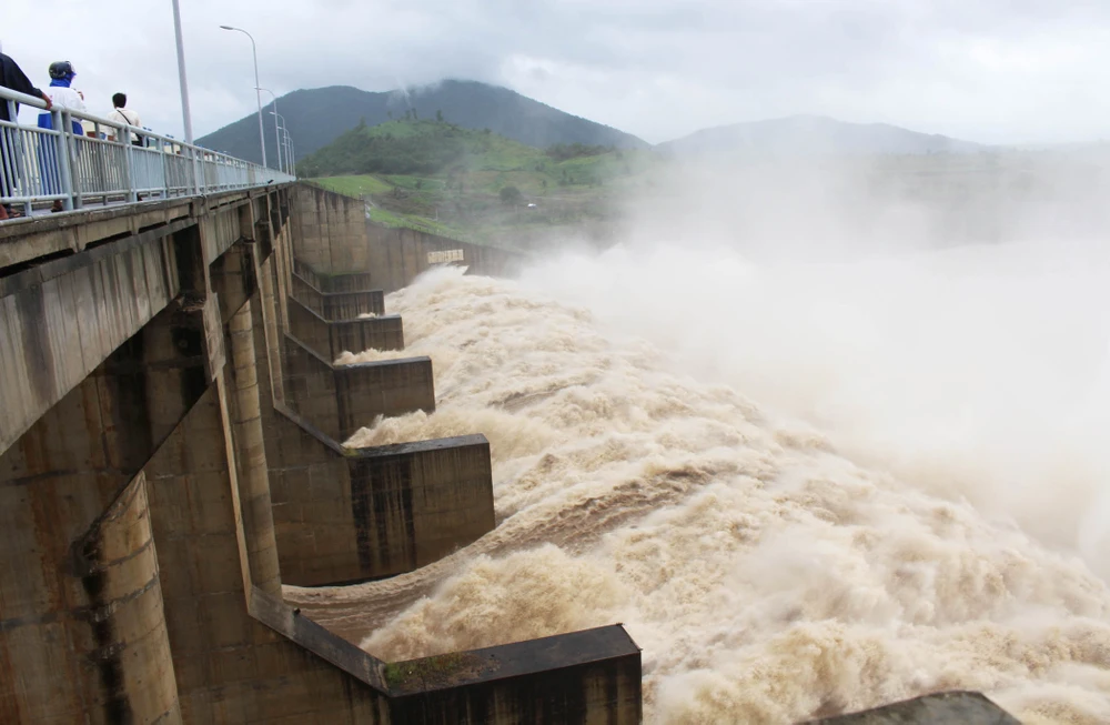 Nhà máy thủy điện Sông Ba Hạ xả lũ với lưu lượng lớn nhất bảy năm gần đây. Ảnh: TẤN LỘC