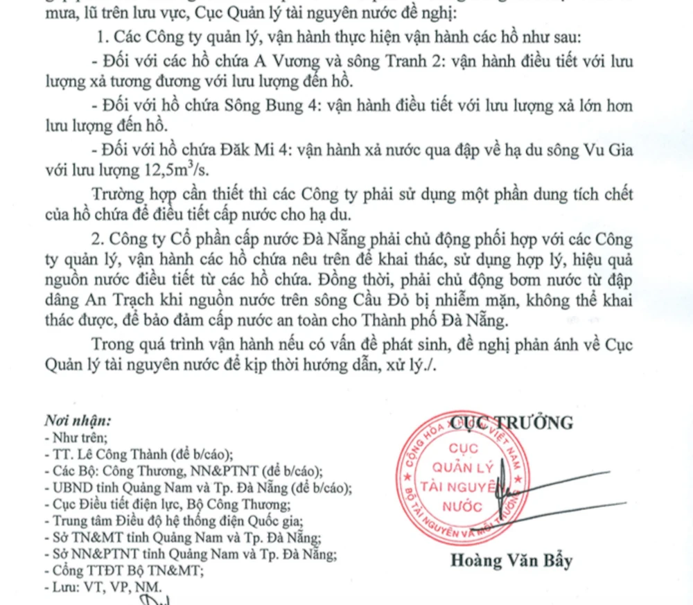 Ngày 13-9, trao đổi với PLO, Sở TN&MT TP Đà Nẵng cho biết ông Hoàng Văn Bẩy (Cục trưởng Cục Quản lý tài nguyên nước, Bộ TN&MT) có công văn hỏa tốc yêu cầu điều tiết nước về hạ du sông Vu Gia gửi các nhà máy thủy điện vận hành hồ chứa A Vương, Đắk Mi 4, Sông Bung 4, Sông Tranh 2.