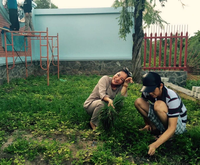Nghệ sĩ Thúy Nga cùng nghệ sĩ Hoài Linh nhổ cỏ trước đền thờ tổ.