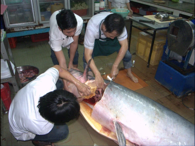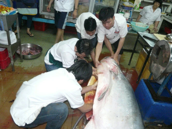 Việc xẻ thịt, chế biến cho thực khách được tiến hành ngay sau đó. Giá trị con cá khi bán ra thị trường ước tính khoảng 350 triệu đồng (tương đương hơn 1,5 triệu đồng/kg).
